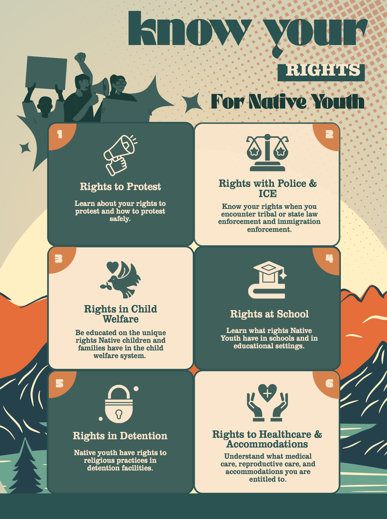 Know Your Rights – For Native Youth Rights to Protest Protestor's Rights Safety and Advocacy for LGBTQ Youth Rights with Police & ICE Encounters with Law Enforcement Indigenous Rights During ICE Encounters Rights in Child Welfare How Does ICWA Affect Children and Teens Rights at School Student's Rights Tribal Regalia Rights in Detention Native Spiritual Practices in Prison Rights to Healthcare and Accommodations Encountering Medical Mistreatment Disability Rights International Indigenous Rights United Nations Declaration on the Rights of Indigenous Peoples (for adolescents)